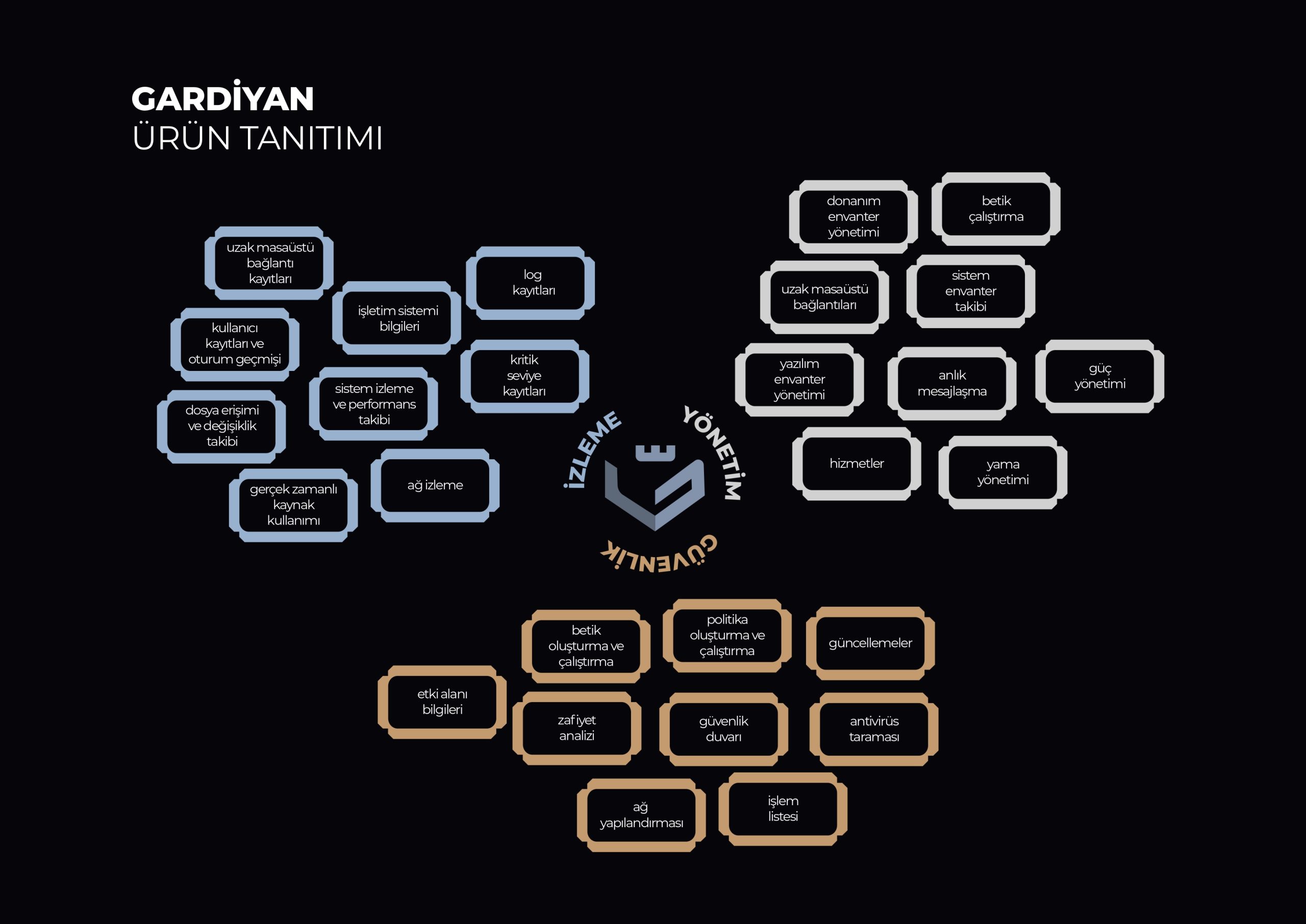 Geniş çalışma ağlarında uçtan uca tüm sistemin güvenli bir şekilde izlenmesini ve yönetilmesini sağlayan, gerektiğinde kurumsal politikalar doğrultusunda sistem yöneticilerini bilgilendiren ve oluşan problemleri bildirerek gerekli önlemlerin hızlı bir şekilde alınmasını sağlayan bir sistem operasyon yönetim yazılımıdır.